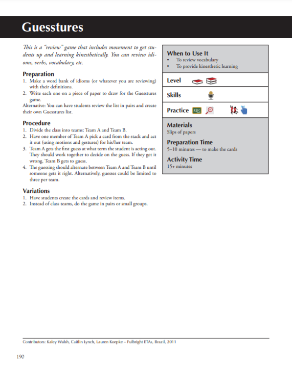 Description: Three activities for classroom use. The first is a card game, the second is a stories activity, and the last is a environment presentation. The first card game isn’t suitable and the others need adaptation. These resources were originally created for English language learners and teachers around the world by the Office of English Language Programs in the Bureau of Educational and Cultural Affairs at the U.S. Department of State.